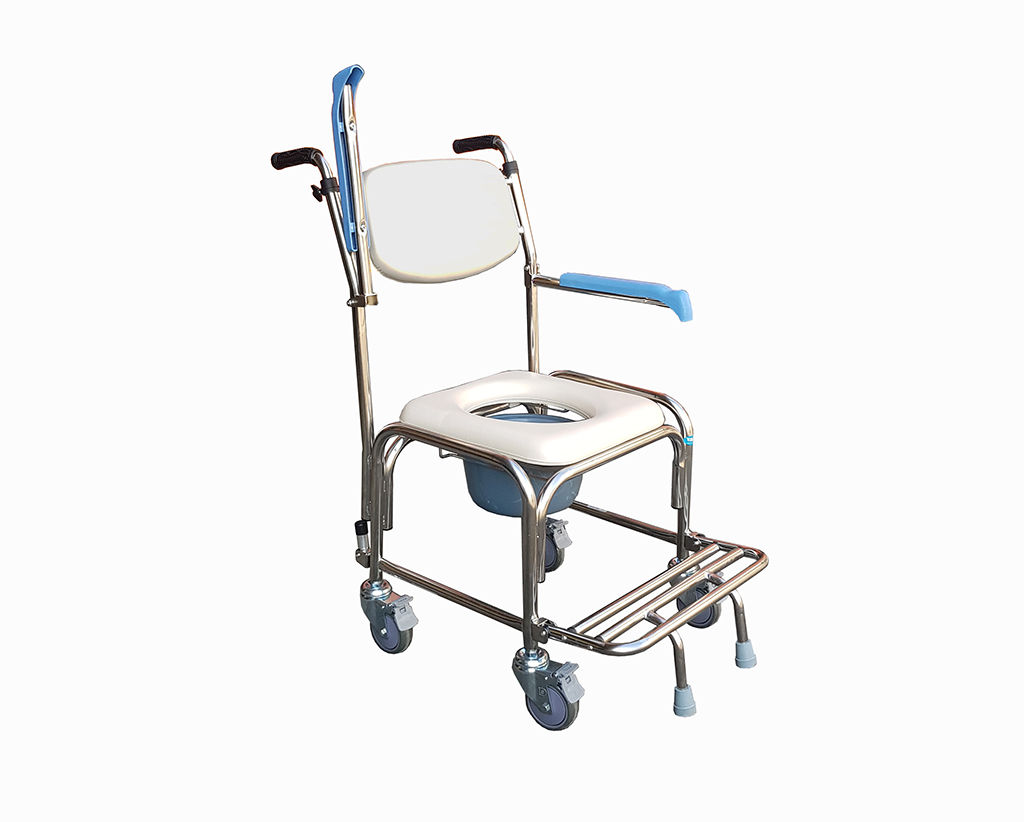 新型專利扶手可掀方便轉移位 新型專利桶架坐墊凹陷及, 新型專利防前傾桿安全裝置 規格: - 外徑尺寸 : 寬53x深85x高97cm。 - 內徑尺寸 : 寬47x深40x高50cm。 - 主體採用φ1"(25mm)不鏽鋼圓管。 - 附四個4"剎車輪。 - 軟背、座墊為防水軟墊。 - 所有尺寸±5%。