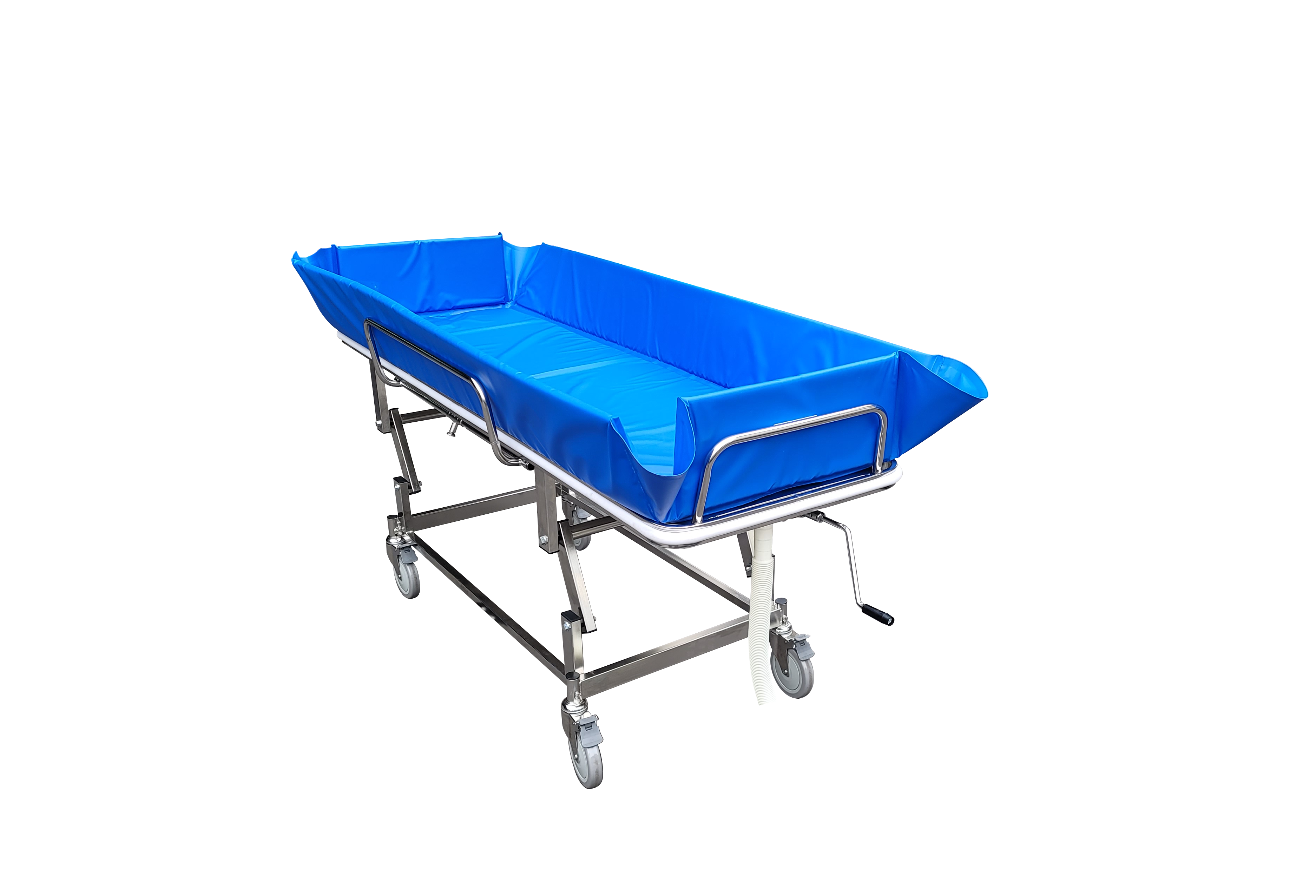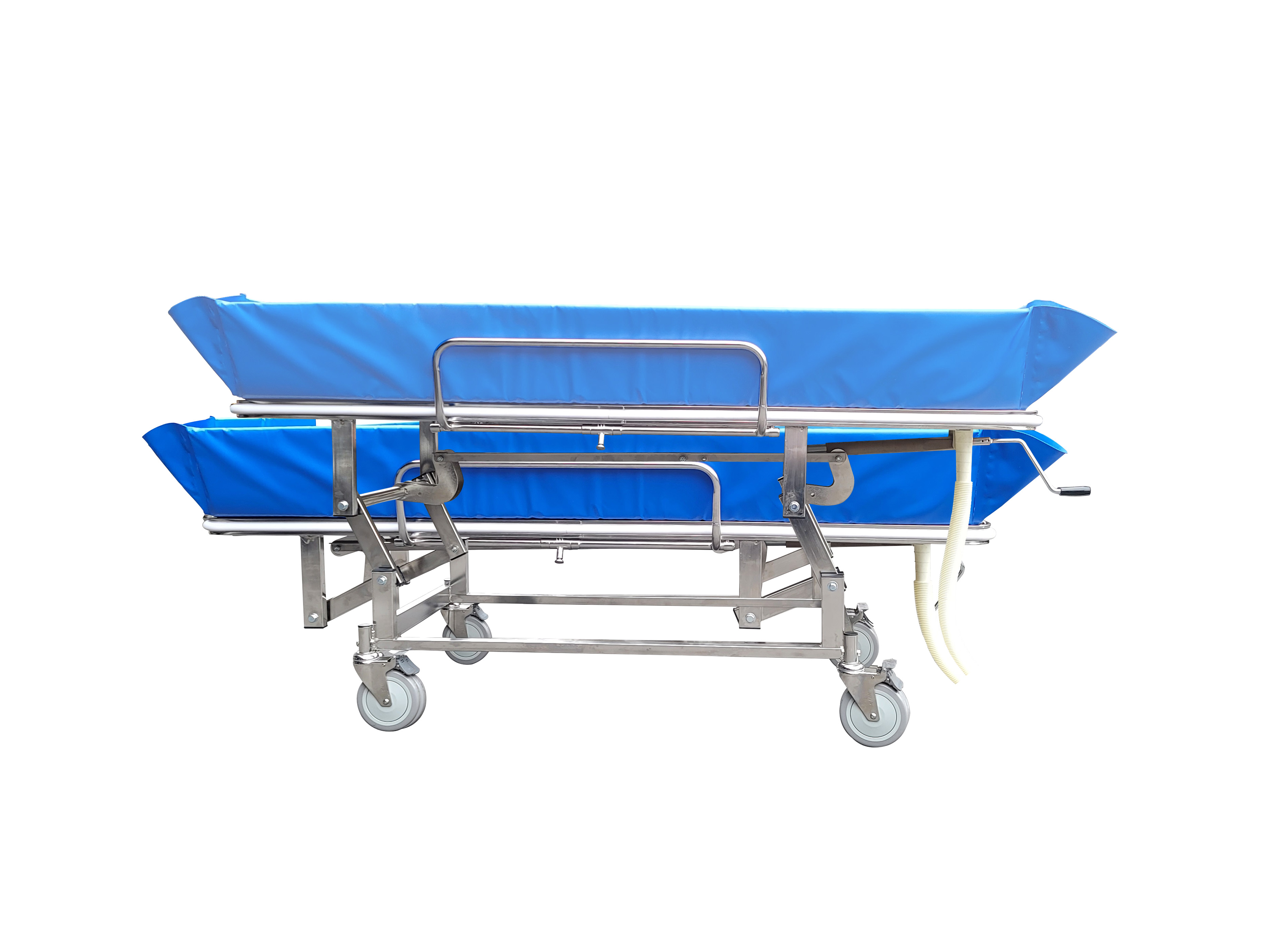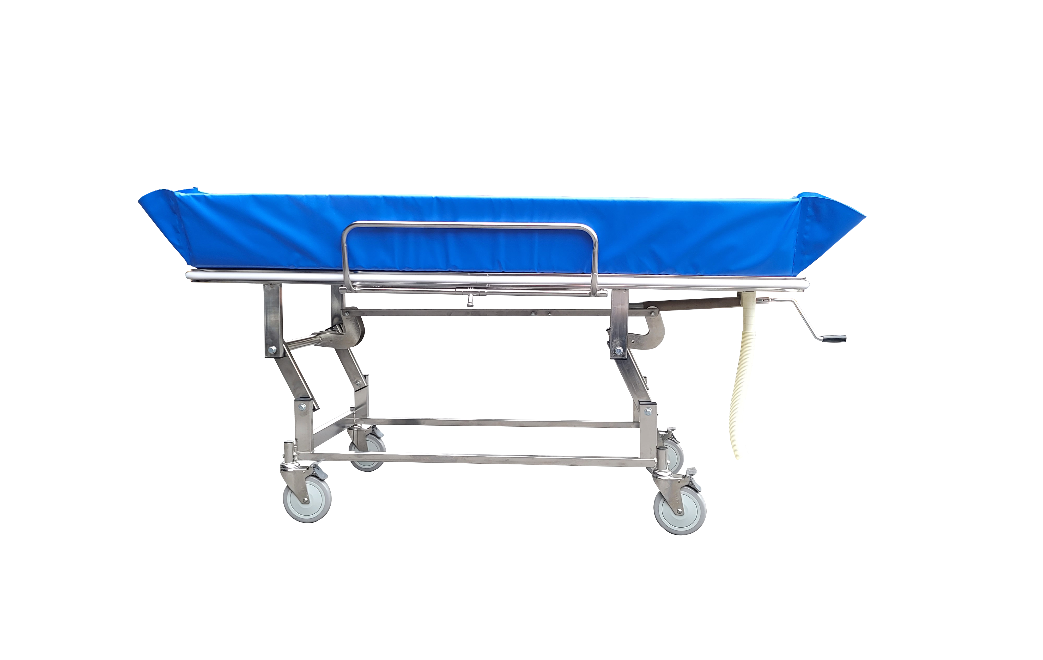 升降採用手搖桿方式,不用時手搖柄可收折,含排水管排水孔位於床尾處。