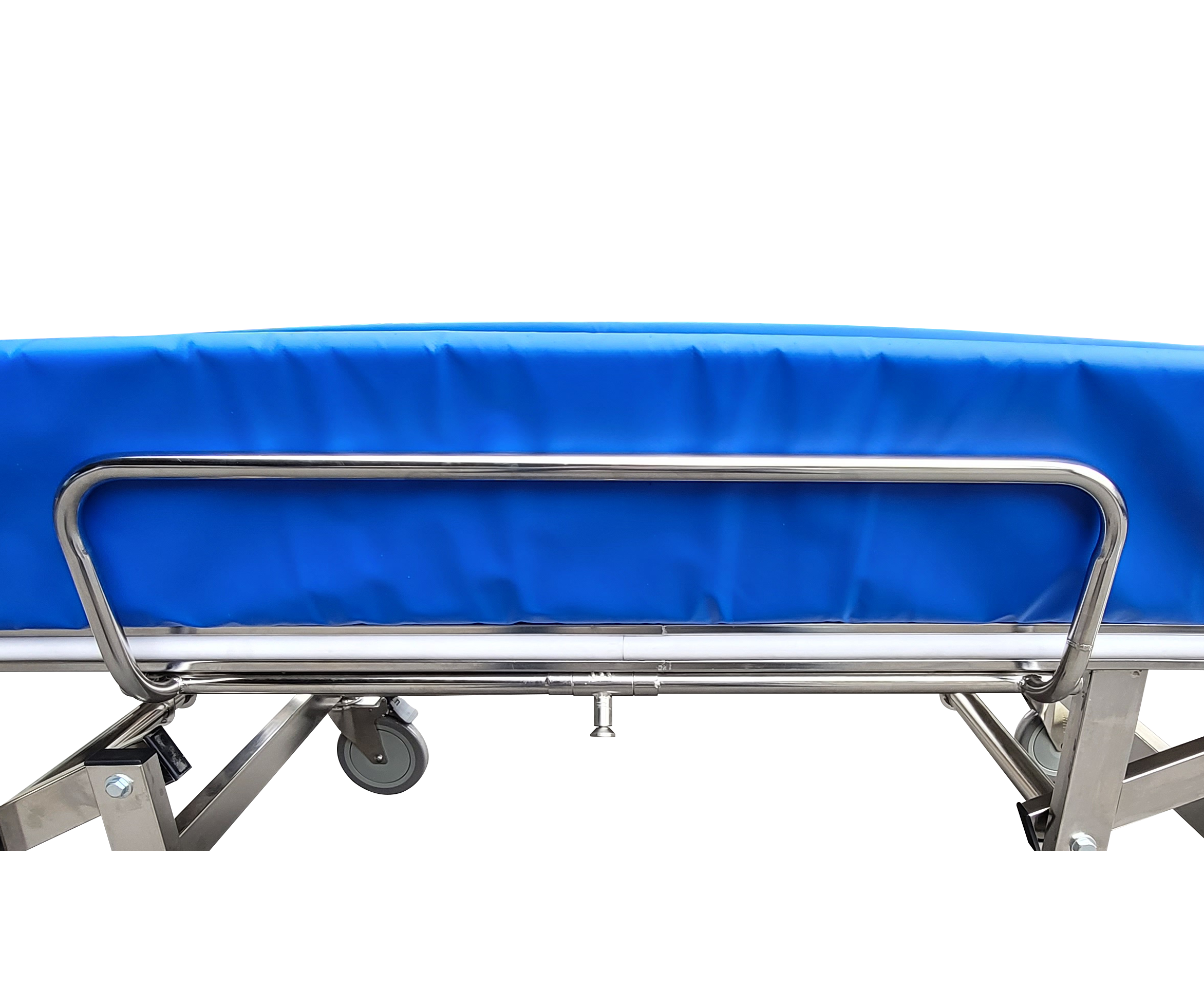採整片式不銹鋼板焊接而成高耐重,床欄頭尾處為固定式,可擋床墊及推送手把使用。